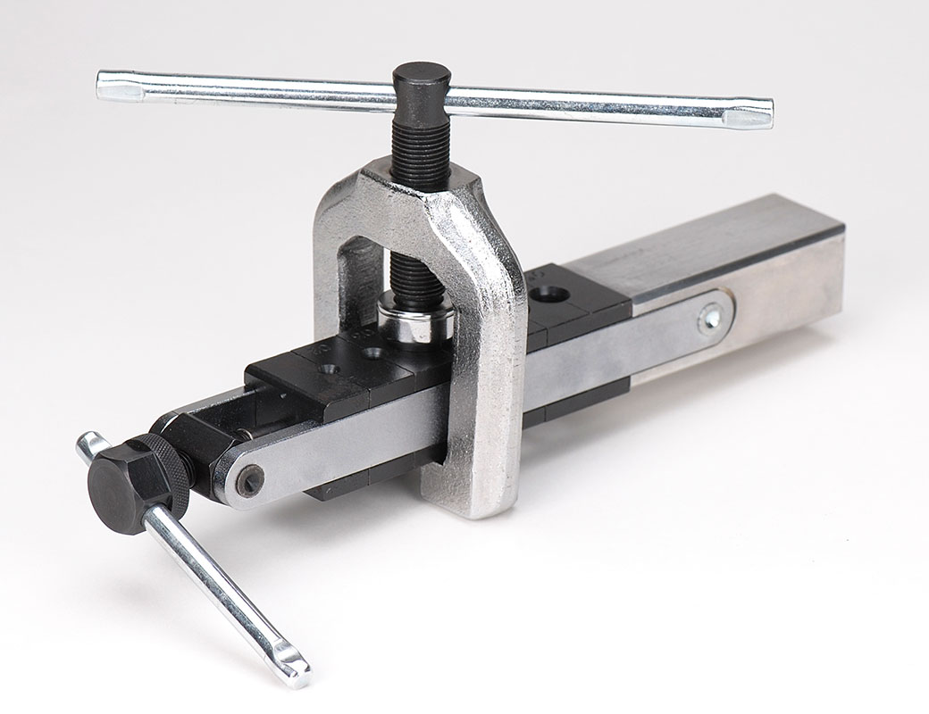Forms 37° flares in annealed stainless steel (MIL-T-6345 or AMS5566), cold drawn stainless steel, copper, aluminum, brass, and other soft metals. Ball thrust bearing mechanism reduces the effort required to produce perfect 37° flares, even in stainless steel. Made of hardened tool steel, and features a non-slip grip which securely holds tubing, even after repetitive flaring. Extension on bar can be clamped in a vise for extra support. Able to flare 1/8” 3/16” 1/4” 5/16” 3/8” and 1/2” O.D. tubing. 4 lbs (1.5Kg) shipping weight.